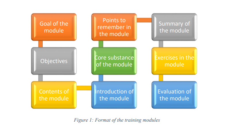 The Facilitators should be familiar with the structure of delivery of each of the five modules. Note that each module follows the same format but training techniques will vary. Nine steps form the format of the modules delivery as illustrated here.